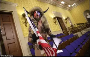 There is also Jacob Chansley, better known as the ‘QAnon Shaman,’ who was photographed while shirtless and wearing bull horns and American flag face paint in the Capitol building.