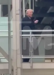 A video shows the president walking across a gangway as he points to a heckler below, mouthing, ‘F*** you.’ Trump then gives the unknown individual the middle finger as he walks away.