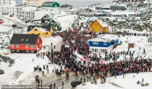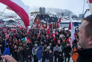 On Saturday, thousands of Greenlanders marched across snow and ice in and around the capital city of Nuuk, waving flags and holding signs declaring ‘Greenland is not for sale’ as they protested Trump’s renewed push to bring the strategically located, mineral-rich territory under U.S. control.