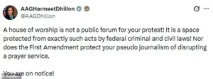 Dhillon took to X (formerly Twitter) to emphasize that ‘a house of worship is not a public forum for your protest,’ a statement that has been widely shared by legal experts and religious groups.