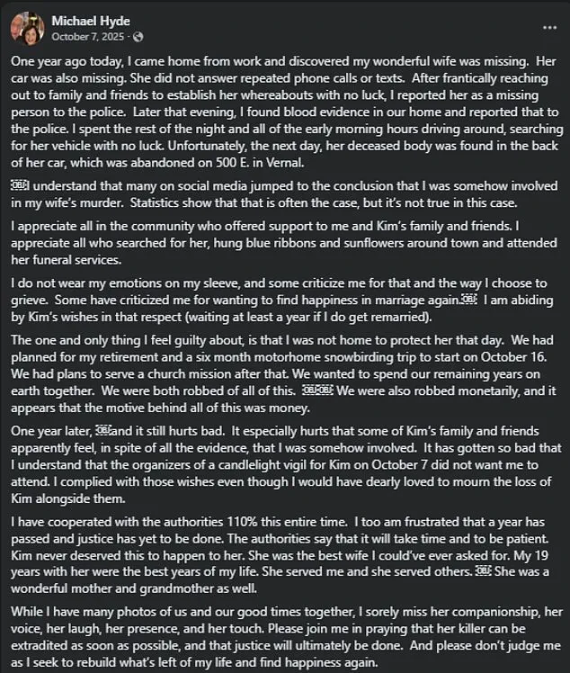 Kimberly Hyde, 60, was found murdered inside her Honda Civic in October of 2024 in Vernal, Utah, some 40 miles from her home in Roosevelt where she lived with her husband of 18 years, Michael, 69.