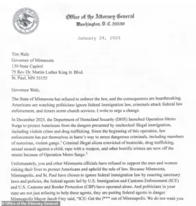 In a three-page letter to Walz, Bondi accused state officials of ‘anti-law enforcement rhetoric’ and warned that federal agents were in danger due to the state’s stance.