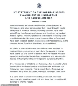 He criticized the use of excessive force against peaceful demonstrations, emphasizing that the right to protest is a cornerstone of American democracy. ‘To make matters even worse, at every turn, the people in charge have lied to us,’ he wrote, pointing to the repeated denials and downplaying of events by Trump officials.