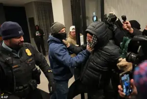 As footage emerged of masked demonstrators smashing windows, spray-painting the hotel with ‘ICE OUT OF MPLS,’ and chanting ‘No justice, no peace,’ the scene underscored the deepening fractures in a country grappling with the aftermath of Alex Pretti’s fatal shooting by border patrol agents.