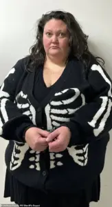 Morgan Morrow wore a skeleton sweater as she frowned in her mugshot