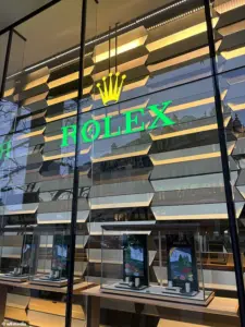 While a nearby Rolex store’s window displayed watches ranging in price from £5,000 to £16,000, with certified, pre-owned versions as expensive as £45,000.