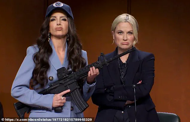 The sketch, which opened with Fey strutting into frame in a pale blue power suit and perfectly styled brunette curls, immediately drew comparisons to Noem's signature 'ICE Barbie' aesthetic, complete with a prop firearm that Fey kept gripped at her side for the duration of the scene.